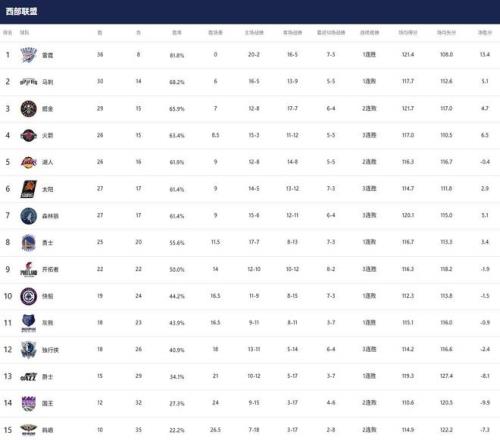 1-3名:雷霆(36胜8负)、马刺(30胜14负)、掘金(29胜15负)